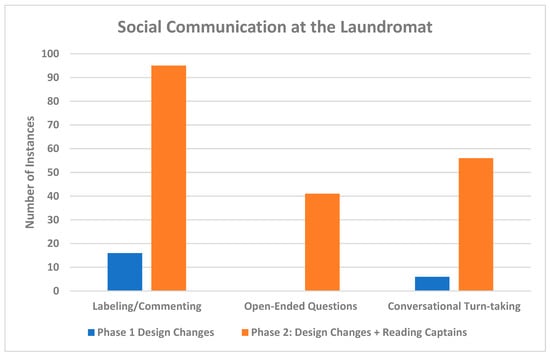 Conversations with an adult (e.g., parent or caregiver) in the play setting were coded as they occurred in real-time using an adapted version of the codebook (e.g., Promoting Communication (PC) Talk) developed by Walker and her team () and known to support child language outcomes. Specific to our research, the research assistants used a checklist marking the presence of a language promotion activity if the adult: (i) labeled objects or things for the child (); (ii) asked an open-ended question (), and (iii) engaged in a conversation (e.g., identified as two discrete utterances between a child and adult dyad (). In the first week, two research assistants were assigned to the laundromat, and used the checklist independently during a day’s activity to establish reliability. Cohen’s Kappa indicated 0.90 on coded variables, occasionally mis-estimating the child’s age. Low-inference notes were also reviewed by the project manager, identifying specific language to determine agreement on coders’ assignments of talk strategies. Once reliability was established, the research assistants individually observed activity for an 8-week period, totaling 16 h of observation in the laundromat.