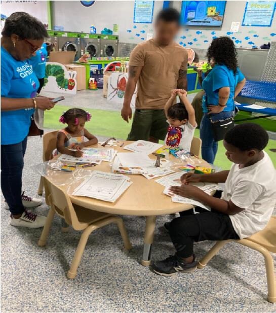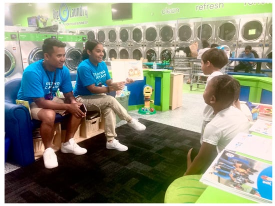 Six Reading Captains, in total, participated in this project (five female; one male). Three were Hispanic; two were African American; one was White (average age: females over 60; male, 40 years old). Based on the demographics of the neighborhood, two Reading Captains were assigned by Global Citizens to each laundromat to read and engage with families in two-hour weekly visits for the next eight weeks. Both were from the immediate neighborhood; in the first laundromat for example, one was Hispanic, and the other was African American. Under the larger umbrella of playful learning (), their task was to engage children in activities such as book reading and play, and to act as an information resource to families about early literacy.
