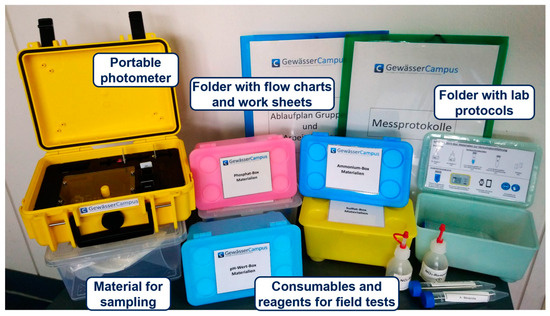 In the preparation phase, the motivation and context of the project day are conveyed with the introductory question, ‘How clean are our local waters?’. The pupils learn how to assess the cleanliness of water bodies, and which characteristic parameters are decisive for water quality. The concept of a water quality index for the assessment of water quality is presented using the BACH-Index (Bach, 1980) as an example of a water quality index. The BACH-Index was chosen as a multiplicative index for assessing water quality based on chemical parameters such as temperature, pH, and concentrations of ammonium, nitrate, and phosphate. It combines these values into a single score to classify chemical water quality. In preparation for the practical phase, the pupils learn how to use the developed didactically prepared and portable GewässerCampus photometer (desklab gUG (haftungsbeschränkt), Schriesheim, Germany) as a measuring device for outdoor water analysis by using the illustrated instructions. During this phase, the pupils also familiarize themselves with the illustrated step-by-step protocols (see Supplementary Materials) for the sampling and the treatment of the water sample with reagents. After dividing the pupils into groups and taking a short break, the class moves on to the outdoor phase with the practical analysis of a water body. The provided experimental kit is taken by the class to the water body of interest. An overview of the experimental kit is shown in Figure 2.