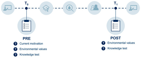 A structural overview of the pre- and post-study procedure during the conducted project day. T0 marks the time when the pre-questionnaire was filled out, and T1 when the post-questionnaire was filled out.