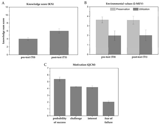 (A): Environmental values, Preservation and Utilization, measured using the Two Major Environmental Values Model (2-MEV) before (T0) and after intervention (T1). (B): Knowledge sum scores measured before (T0) and after intervention (T1). (C): Current motivation measured using the Questionnaire on Current Motivation (QCM) with its four scales (fear of failure, interest, probability of success, challenge) before intervention (T0). The error bars show 95% CI.