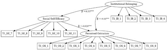 Following the validation of the measurement model, a structural equation model was estimated to test the hypothesised relationships between the study variables. Analyses revealed that institutional belonging significantly positively predicted social self-efficacy (H1: β = 0.33, p < 0.001). Also, a significant negative association was found between institutional belonging and predicted perceived ostracism (H2: β = −0.44, p < 0.001). Finally, a significant negative association was found between social self-efficacy and predicted perceived ostracism (β = −0.28, p < 0.001). Figure 2 shows the test model with standardised path coefficients and structural model diagram with standardised coefficients.