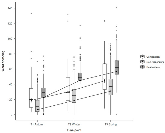 Boxplots of the development of word decoding skills for the three groups between test occasions T1 (autumn), T2 (winter), and T3 (spring). The boxes contain the 25th to the 75th percentile, the median is marked with a horizontal line, and the means are the markers connected with lines between time points. The whiskers of the means denote 95% confidence intervals; the whiskers of the boxes denote the furthest data point within 1.5 * IQR from the box and datapoints outside of this are outliers that are plotted individually.
