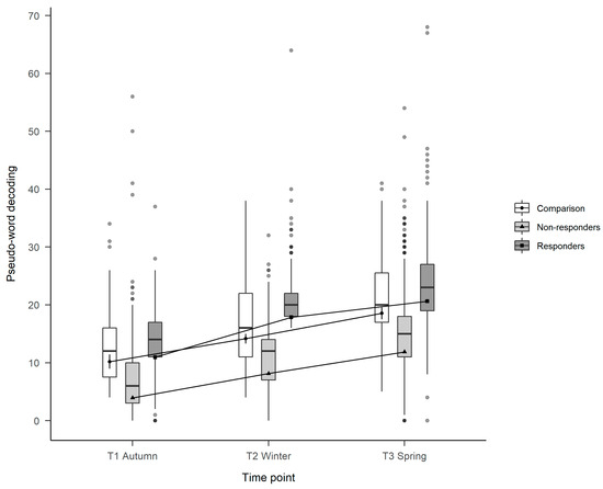 Boxplots of the development of pseudo-word decoding skills for the three groups between test occasions T1 (autumn), T2 (winter), and T3 (spring). The boxes contain the 25th to the 75th percentile, the median is marked with a horizontal line, and the means are the markers connected with lines between time points. The whiskers of the means denote 95% confidence intervals; the whiskers of the boxes denote the furthest data point within 1.5 * IQR from the box and datapoints outside of this are outliers that are plotted individually.