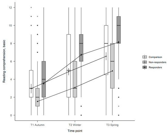 Boxplots of the development of basic reading comprehension skills for the three groups between test occasions T1 (autumn), T2 (winter), and T3 (spring). The boxes contain the 25th to the 75th percentile, the median is marked with a horizontal line, and the means are the markers connected with lines between time points. The whiskers of the means denote 95% confidence intervals; the whiskers of the boxes denote the furthest data point within 1.5 * IQR from the box and datapoints outside of this are outliers that are plotted individually.