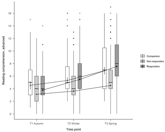 Non-responders showed a relatively steady improvement in basic reading comprehension between T1 and T3 (see Figure 3). This indicates that the recommended decoding focus was relatively effective regarding the development of skills necessary for basic reading comprehension. The gap between non-responders and the comparison group remained the same at T1, T2, and T3. For advanced reading comprehension (Figure 4), the gap increased somewhat, and the non-responders did not seem to be ready for such demanding tasks, despite having increased their decoding skills.