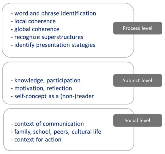 Rosebrock and Nix (2020) understand reading using multiple levels. They emphasise that reading a text requires action on the process level, draws on resources from the subject level, and is connected to the social level of the reader. One example is reading in schools, which is typically linked to specific reading tasks in a classroom setting. In this context, the individual reader (the subject) engages with the text on the process level and is embedded within a social reading environment—the class. To promote reading to adolescents, further motivational approaches are implemented in schools. The approach reading for pleasure does not focus on tasks that are set by teachers (Cremin & Scholes, 2024; Boyask et al., 2024). This approach allows readers to participate in book choices, reading times and lengths, reading support, and self-organised reading tasks. Even reading tasks and environments that are planned by teachers and students in collaboration are encouraged to promote reading at the following three levels: the process, subject, and social levels. To define the three levels of reading more clearly, consider the following descriptions: