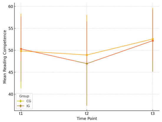 Over time, both groups showed fluctuations in their mean reading competence. Notably, the IG started with a slightly higher average score at t1, experienced a dip at t2, and then saw improvement by t3, surpassing their initial mean. The CG followed a similar trend, ending with a higher mean at t3 than at t1. The variability in scores (as reflected in the standard deviations) also changed over time, indicating differences in consistency among participants’ performance.