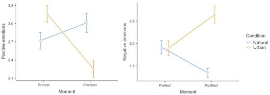 Regarding the composite variable of negative emotions, a significant main effect of condition was found (Table 2), F(1, 88) = 87.77, p < 0.001, np2 = 0.50, indicating that scores differed significantly between the natural and urban soundscape conditions. The interaction between time and condition was also significant, F(1, 88) = 128.59, p < 0.001, np2 = 0.59, suggesting that the effect of time varied depending on the condition (Figure 1). Post hoc comparisons (Table 3) indicated that listening to the urban soundscape led to a significant increase from pretest to posttest, t(1, 88) = −6.88, p < 0.001, d = 1.03, while exposure to the natural soundscape resulted in a significant pre-post decrease, t(1, 88) = −0.049, p < 0.001, d = 0.49. Similarly, posttest scores were significantly higher following exposure to the urban soundscape compared to the natural soundscape, t(1, 88) = −13.03, p < 0.001, d = 0.94.