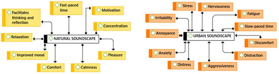 Regarding the listening experience of both soundscapes, the participants agreed on the emotions they had experienced (Figure 2). The natural soundscape, for example, was associated with positive sensations such as pleasure, relaxation, tranquility, and comfort; with a state conducive to reflection, concentration, and motivation; and with the perception that time passes more quickly. In contrast, the urban soundscape was linked to higher levels of stress, nervousness, overwhelm, and aggression; with a more distracted and irritable mental state; and with the sensation that time passes more slowly. Additionally, some participants noted that the soundscape in which they had spent their childhood and adolescence influenced their listening experience. Specifically, those who had lived in a rural setting were more sensitive to the urban soundscape than those who had grown up in a large city.