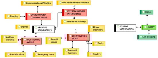 Regarding the soundscapes identified on the university campus, most of them were classified as negative (Figure 3). First, the high-density avenue adjacent to the main lecture hall was a source of noise from motor vehicles, emergency sirens, and loud warning signals, as well as a low-frequency rumble caused by the passing tram. Second, the study was conducted while long-term construction work was taking place on the campus grounds. This resulted in continuous noise from heavy machinery, trucks, grinders, pneumatic drills, and various acoustic signals. Third, participants identified overcrowded areas with high conversation volumes that hinder communication, as well as interference between classrooms due to the presence of reverberant hallways and partition walls lacking necessary sound insulation. In contrast to these soundscapes, the participants noted that the library offers a positive soundscape, as its limited traffic creates a quiet space.