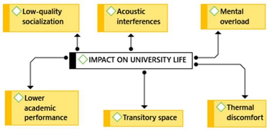Regarding the impact of soundscapes on university life, the participants focused on the negative aspects resulting from noise-saturated spaces (Figure 4). They indicated that overcrowding in classrooms and common areas negatively affects the quality of socialization, as environmental noise hinders communication and encourages isolation through the use of headphones to reduce noise exposure. This situation also prevents mental rest, creating a sense of saturation that makes relaxation difficult and that increases cognitive fatigue. As a result, the participants reported experiencing reduced concentration and higher levels of anxiety, factors that can affect their academic performance. Furthermore, the lack of suitable spaces discourages students from staying on campus to study or eat, leading some to relocate to a nearby university campus in search of better conditions. Thus, their campus, rather than being an environment that encourages engagement and learning, is perceived as a transit space. In the classroom, they pointed out that external noise prevents windows from being opened, which, during hot weather when the cooling system is not functioning, leads to thermal discomfort, once again resulting in greater difficulties with attention and concentration. On the other hand, acoustic interference in the classroom forces instructors to raise their voices to be heard, which can foster a perception of greater authoritarianism and further hinder content comprehension.