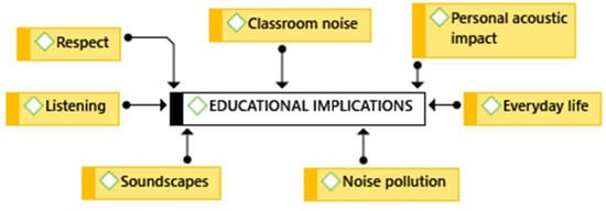 Regarding the implications that soundscapes can have on elementary education teaching, the participants agreed that soundscapes should be introduced into the classroom. The main goal they highlighted was to contribute, through various teaching proposals (Figure 5), to the development of a more aware and critical citizenship concerning noise pollution. They emphasized the importance of fostering respect for others by raising awareness of one’s own noise, including voice tone and the use of electronic devices. It was suggested to maintain low noise levels in the classrooms to prevent their normalization, along with explicit awareness-raising on noise pollution and the introduction of the soundscape concept through debates. To achieve this, activities were proposed to assess the impact of noise and explore silence and active listening. Furthermore, it was emphasized that these actions should not be limited to isolated interventions but should be integrated into the everyday life of the educational institution. The need to experience different soundscapes through sound walks and sound identification was underscored, encouraging reflection on their impact on the environment. Finally, it was considered essential to involve students in transforming these soundscapes, promoting their active participation in improving the school’s acoustic environment.