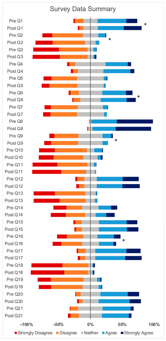 We performed statistical analysis on the students’ responses on the pre-/post-survey by adapting the Likert scale to be a numerical scale, with 1 corresponding with ‘strongly disagree’ and 5 with ‘strongly agree’. To determine whether or not we could reasonably group all survey data collected across eight different semesters (data was not collected in Fall 2021), we conducted a one-way ANOVA based on semester. The Tukey post hoc analysis found no significant differences in 33 out of 42 prompts (the 21 statements were each presented twice, once for pre and once for post) between semesters. Of the nine comparisons that did show significance (Q8 pre and post, Q11 pre, Q15 post, Q17 pre, Q19 post, Q20 post, and Q21 post), only minor differences were found between a few semesters, and no systematic patterns were revealed across the prompts (i.e., certain semesters were not driving the identified differences). Accordingly, due to the limited inter-semester differences, all pre- and post-data across semesters for each prompt are pooled and analyzed for aggregate differences.
