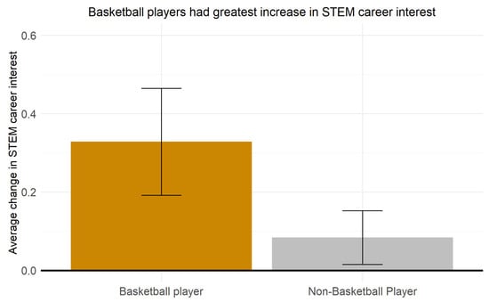 The increase in STEM career interest was also strongest among basketball players, , . Students who did not play basketball showed a small but significant increase in STEM career interest, , 95% CI , , , d = 0.10, 95% CI [0.02, 0.19]; however, basketball players had a larger increase in STEM career interest, , 95% CI , , , d = 0.34, 95% CI [0.19, 0.48] (see Figure 3).
