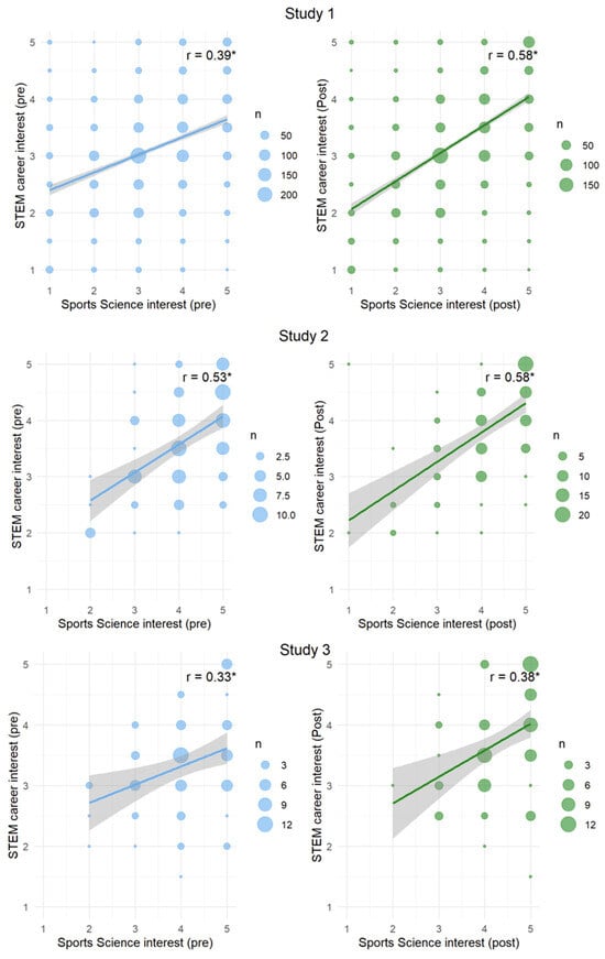 Sports Science interest and STEM career interest correlation (pre vs. post). Note. * denotes p < 0.05.