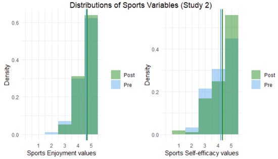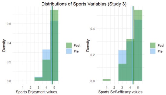 Histograms of pre- and post-sport enjoyment and sport self-efficacy scores in Study 3. Note. Lines represent means.