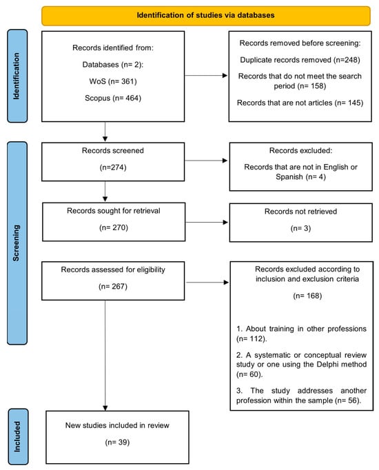 Subsequently, those studies that did not meet the time range for publication were eliminated, excluding 158 documents. Then, 145 studies that did not meet the criteria of being articles were excluded, leaving a total of 274 investigations. After a manual review of the language of these articles, 4 were eliminated if they did not meet the criteria of being in Spanish or English, resulting in 270 articles for analysis based on the inclusion and exclusion criteria.