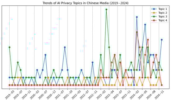 In contrast, Topic 4 remained comparatively peripheral in 2023–2024, with only sporadic peaks tied to restrictions on U.S.–China academic cooperation or national security legislation affecting AI research funding. While these episodes occasionally generated media attention, the broader discourse continued to focus on AI monitoring, student privacy, and technology company compliance. Overall, Figure 1 underscores that Western media reporting on AI privacy within universities has remained event-driven rather than reflecting a stable, policy-focused conversation. As GDPR enforcement intensifies, AI regulatory policies evolve, and technology companies adapt their data governance practices, it is likely that Western media coverage will continue to revolve around emergent controversies, placing legal obligations, corporate responsibilities, and the ethical challenges of AI implementation at the forefront.