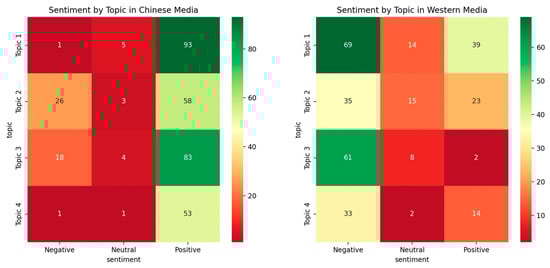 Our comparative findings must be interpreted in light of structural differences between Chinese and Western media systems. The Chinese-language news corpus primarily consists of articles retrieved from four authoritative and widely circulated sources via Nexis Uni. These sources are primarily state-affiliated and generally operate within a centralized media environment characterized by editorial alignment with national policy objectives. In contrast, the Western corpus includes a wider range of commercial and independent outlets. These systemic differences in media governance and institutional autonomy likely contribute to the observed variations in sentiment and topic framing. Although this study does not perform a detailed source-level comparison, we acknowledge that further analysis of source diversity—particularly within Chinese media—would add valuable insight and remains a promising direction for future research.