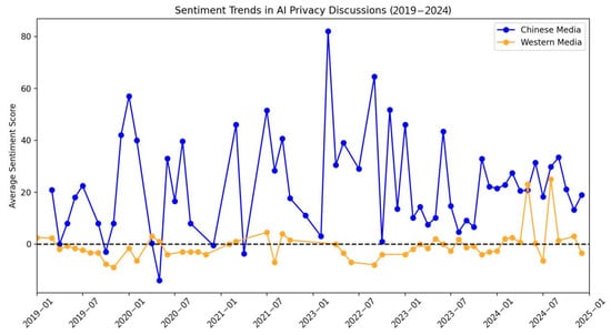 This section presents the results of a sentiment analysis of AI privacy discourse in Chinese and Western media from 2019 to 2024. The results show that people have very different sentiment patterns and topic concerns in different media environments, which reflects the diverse manifestations of AI privacy issues in different sociopolitical environments. Figure 3 displays the sentiment distribution of AI privacy discussions in Chinese and Western media, respectively. The results indicate that Chinese media show overwhelming positive sentiment on AI privacy-related issues, with more than 80% of news with positive sentiment. Neutral and negative sentiments are relatively rare. The sentiment distribution of Western media is more diversified, with a much larger proportion of negative and neutral articles than in Chinese media. Although positive sentiment still dominates, negative articles also occupy a considerable proportion, indicating concerns about AI surveillance, data privacy risks, and regulation issues. Chinese media cover the development of AI in a very positive and government-supportive way, emphasizing technological innovation and industry growth. Western media are more critical in their coverage, often highlighting ethical issues, data protection challenges, and governance problems.