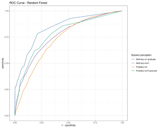 Figure 1 shows the ROC curve for the RF model, demonstrating the efficiency of this model for performing classification according to students’ perceptions of graduation. The curve of the “definitely won’t graduate” category has the highest true positive rate, which shows that the model is very efficient at identifying those students who are very sure that they will not graduate. The steep rise of the curve shows high sensitivity and specificity for this group. Building upon this, as shown by the green curve, the RF model effectively distinguishes students who believe they “probably won’t graduate” from the rest of the groups, with slightly lower true positive rates than the previous category. The violet curve represents the “definitely will graduate” class, and shows a somewhat lower true positive rate; the model is still accurate, but is somewhat less effective at classifying students who are very confident of graduating. The lowest value of the true positive rate among the four classes is observed for the “probably will graduate” class, which indicates that the model is least effective in identifying those students who are moderately optimistic about their graduation. One possible explanation for this lower performance is the internal data distribution within this class, which leads to significant conditional overlap with other categories.