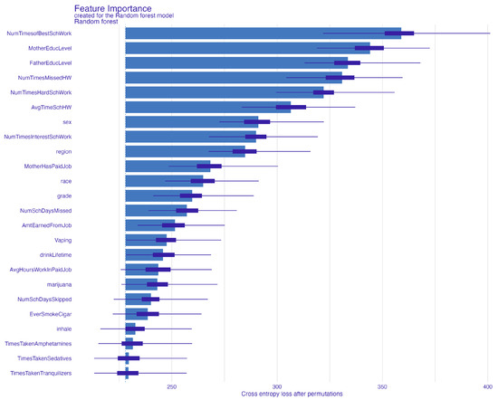 The permutation-based feature importance is presented in Figure 2, showing that the frequency of students’ engagement in their best schoolwork is the most important feature in the RF model. Students doing their best school work is understood as the student’s self-assessment of the degree to which they exert maximal effort, focus, and thoroughness on assignments, exams, and other school-related activities. Maternal educational level is ranked second, and its role in determining students’ graduation expectations is critical, while paternal educational level is ranked third. The fourth most important factor is the number of times a student missed homework, which means that regular attendance in classes and completing homework is a good predictor of students’ expectation to graduate. Following these, another important predictor is how often students participated in their most difficult school work, which supports the previous findings on the relationship between study habits and students’ attitudes towards education. Accordingly, the major characteristics of interest are those related to academic engagement and parental educational background, which, as theory would predict, have a greater influence on students’ perceived chances of graduating.