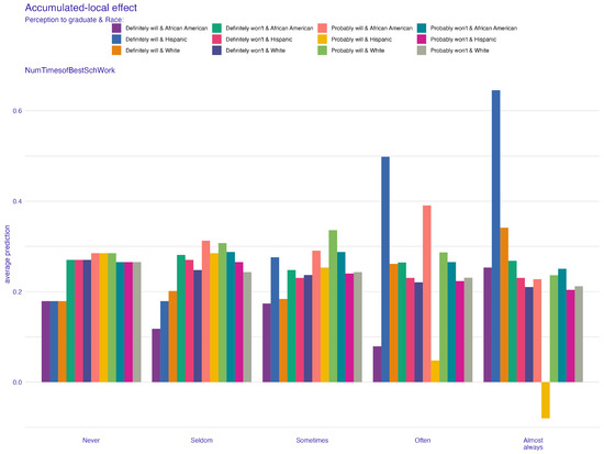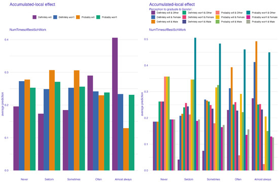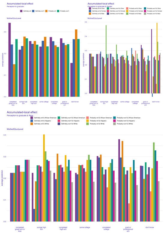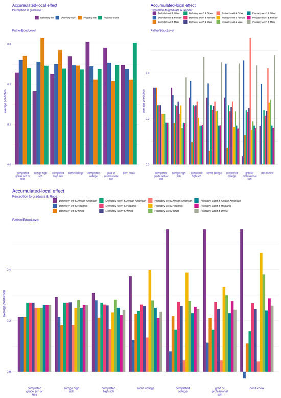 The ALE plots provide further important insights into the role of parental education in shaping students’ perceptions of their likelihood to graduate. In these bar-style ALE plots, the y-axis labeled “average prediction” represents the mean model-predicted probability of the target graduation perception category across all observations within each feature bin, illustrating how shifts in parental education impact predicted perceptions. For instance, higher levels of maternal and paternal education are positively associated with stronger perceptions of graduating, as seen in the top left of Figure 3 and Figure 4. Students with at least one parent who attended college or received a graduate or professional school education are likely to have higher predicted perceptions of graduation than students whose parents have less education (for example, grade school or some high school). For instance, Figure 4 shows that students whose mothers have a professional education have a clear increase in average predicted perception scores. Figure 3 shows similar patterns for paternal education; that is, graduate-level paternal education is associated with an increased perception of graduating.