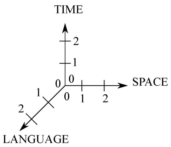 Therefore, as there are 3 different dimensions, where each of them may have 3 values available, then an overall amount of scenarios could be set up, where all combinations are possible, although some of them are more common than others (Roig et al., 2024a). Figure 1 depicts the positive octant of a 3D Euclidean space, where values 0, 1, 2 are assigned to each axis, and the order of a given triplet is (space, time, language).