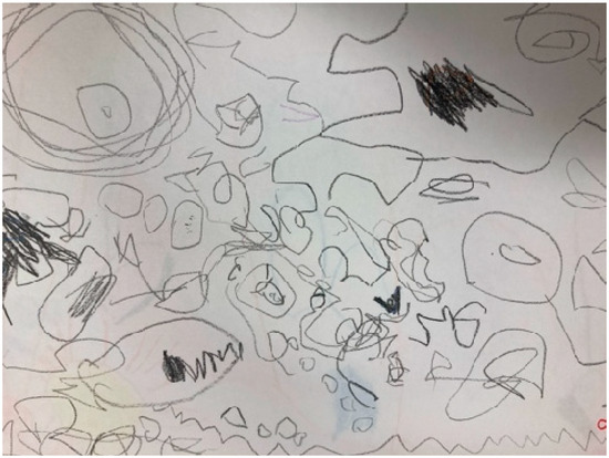 As for controlled scribbling, we classified 32 drawings as in this category (Figure 4). This is a phase in which infants discover the connection between their movements and the strokes they execute on paper, which usually occurs around the age of three. The drawings represent an improvement in visual–motor coordination, they repeat patterns such as horizontal and vertical lines and circles, and sometimes associate their scribbles with objects or experiences in their environment. Control of scribbling reflects progress in other areas of their development, such as the ability to manipulate objects (fitting pieces into a puzzle, pouring water into a glass, eating with a spoon or fork, turning the pages of a book) and is the beginning of visual–motor integration.