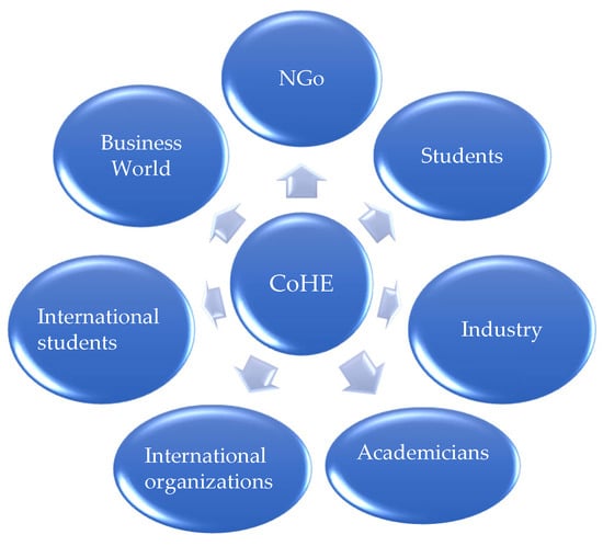 Figure 1 illustrates the structure of Turkey’s higher education landscape before the 2000s, highlighting the central role of the CoHE. At this time, universities operated under a more centralized framework, with CoHE exerting significant influence over academic policies, university governance, and institutional operations. The structure shown in Figure 1 reflects the relatively straightforward organization of universities, where interactions primarily occurred between CoHE, universities, students, and academics, with limited external collaboration or influence. Students and academics were integral to the university environment, yet their roles and contributions were guided mainly by CoHE’s regulations, fostering a somewhat rigid academic system. This setup contrasts with the more diversified and dynamic higher education landscape in later years, shaped by globalization, increased autonomy, and various stakeholders’ involvement in university affairs.