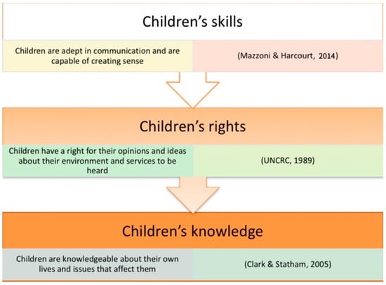 22. Mazzoni, V., & Harcourt, D. S. (2014). An international experience of research with children: Moving forward on the idea of children’s participation. Qualitative Research, 14(2), 252–268. [Google Scholar] [CrossRef]