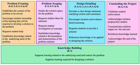 Once the coding of the letters was completed, researchers analyzed patterns in the combinations of codes to establish categories within each client letter. Analysis of the coded letters led to the identification of six larger categories within individual client letters: problem framing, problem scoping, design detailing, concluding the project, knowledge building, and identity building. The first four of these categories relate to the engineering design process within the STEM integration learning activity. Knowledge building was an additional category that emerged from the analysis of patterns in the client letters. Figure 1 provides descriptions of the categories and details for the codes from Table 4 that primarily relate to each of the categories. Whereas, identity building is more related to the immersive experience and will be discussed with the findings related to the pillars of immersive education.