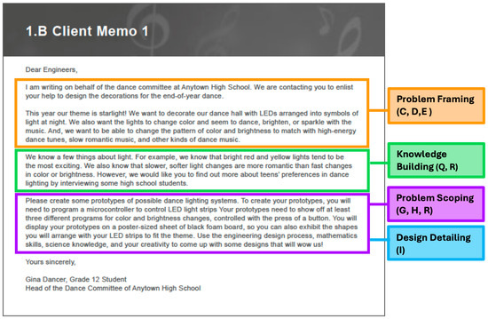 Aligned with the motivation-trigger pillar, client letters establish a compelling reason for students to act. By connecting the real-life context of the narrative to the reason behind the intended learning, or knowledge building, client letter narratives help connect why students are learning with what they are learning, using the need for a response back to the client as motivation for that learning. For instance, some client letters pose authentic questions or requests—such as investigating perceptual phenomena or researching environmental conditions—that link directly to core disciplinary concepts. By making explicit requests of the students, referencing real end users and clients, and connecting design requirements to a real-world need, the letters serve as a narrative “call to action” that justifies the learning process and knowledge building required (Guzey et al., 2016; Leak et al., 2023; Reiser et al., 2021).