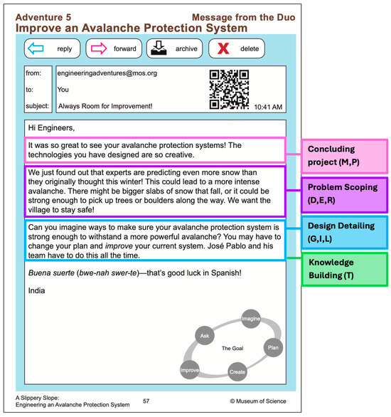 Finally, the support for continuous engagement is exemplified not only through the use of rich narrative, but also through the intentional sequencing of messaging themes in a way that encourages ideation, investigation, and other creative participation by the students in response to client requests. In Engineering Avalanche, client letters guide students through four different design challenges over the course of eight letters. The students are asked to build a tower, design different catches and barriers, and plan and build an avalanche protection system. Students are often asked to investigate and ideate on questions that require a response. Each letter in a curricular unit builds upon the last, often shifting or expanding the solution space of the problem, introducing new constraints, or providing feedback. This establishes a learning environment in which student ideas, artifacts, and other responses become central to how the story moves forward. Requests from the client for ideation, investigation, and other creative participation from the students create opportunities for continuous engagement (Brunetti et al., 2024).