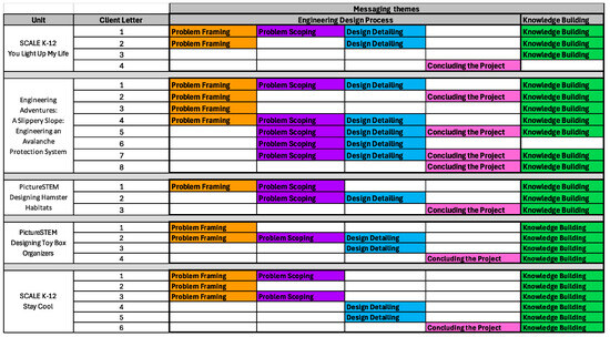 In this section, we discuss how the use of narrative in client letters can be used to synergize elements of the learning experience, including curricular progression and knowledge building within the unit. Our analysis suggests that client letter synergies are observed across the narratives of the letters within a unit, with each new client letter building upon the narrative in the prior letter. Within a unit, client letter narratives are specific to the context and learning of that curricular unit, which means we did not identify a typical pattern of implementation across all units. The number of client letters within a unit also varied, ranging from 2 letters to 10 letters. However, we did observe that the client letter narratives primarily followed the engineering design process, connecting the sequence of curriculum progression through messaging around problem framing, problem scoping, design detailing, and concluding the project—yet with room to move between them fluidly as needed for the storyline. We also observed a pattern of knowledge building that was synergized across client letter narratives, making connections between the knowledge needed from the content of the unit (e.g., technical/STEM knowledge) as well as contextual knowledge from the problem (e.g., client needs, environmental constraints, etc.). The use of messaging in client letter narratives provides the opportunity to synergize elements of the learning process. We saw that the engineering design categories plus the knowledge building within the client letters provided messages to students about their learning experiences. We have termed these categories “messaging themes”. Figure 4 represents a cross-section of different units chosen to exemplify the different ways that messaging themes (problem framing, problem scoping, design detailing, concluding the project, and knowledge building) were applied to the client letter narratives. Our discussion of the messaging themes will first include the client letter narratives that synergize curriculum flow through the engineering design process followed by a separate discussion of the use of client letter narratives to synergize knowledge building within the unit.