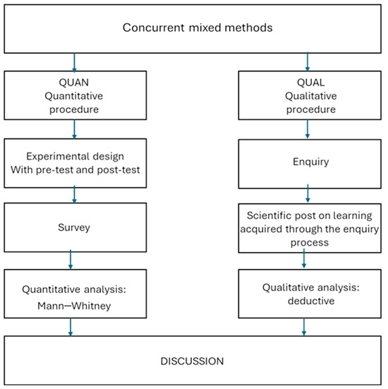 A concurrent study was conducted using mixed methods, involving the simultaneous collection of quantitative and qualitative data (Sampieri et al., 2014). The mixed-methods approach entails a systematic set of research processes, followed by their integration and joint discussion, to achieve a more complete understanding of the phenomenon under study (Sampieri & Mendoza, 2018). The choice of this method aligns with the research objectives, allowing for a more holistic response and enhancing the explanatory power of the results. Specifically, the combination of both methods will enable us to compare students’ knowledge assimilation about natural spaces and biosphere reserves before and after completing the course. Additionally, it will enrich the interpretation of these results through the creation of a scientific poster by the students, addressing concepts related to biosphere reserves using an inquiry-based methodology. The study was conducted within the context of the course “Fundamentals and Didactics of Biology Education” in the dual degree program of Early Childhood and Primary Education at the Complutense University of Madrid (Madrid, Spain). The research design followed methodological recommendations on mixed methods (Teddlie & Tashakkori, 2011). The following describes the process followed and identifies the two approaches (Figure 2).