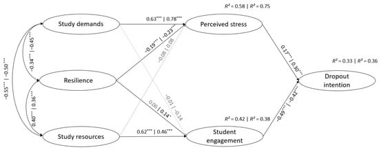With regard to the result presented in Figure 2 for the pandemic study conditions, the SEM can confirm that the health-impairment process aligns with hypothesis H1a, according to which high study demands are associated with high perceived stress (β = 0.67; p < 0.001). In addition, high perceived stress is associated with a high dropout intention (H3) (β = 0.17; p < 0.001). The indirect effect of study demands on dropout intentions via perceived stress (H6a) was significant (b = 0.11; p = 0.001). However, contrary to hypothesis H2b, study resources are not related to perceived stress (β = −0.01; p = 0.971). The hypothesised motivational process can be verified (H2a). According to this, high study resources are associated with high student engagement (β = 0.62; p < 0.001). Furthermore, high student engagement is associated with low dropout intentions (H5) (β = −0.49; p < 0.001). The indirect effect of study resources on dropout intentions via student engagement (H7b) was significant (b = −0.31, p = 0.001). In contrast, student engagement is not significantly related to study demands (H1b) (β = −0.02; p = 0.838). With regard to resilience, the results show that under pandemic study conditions, resilience is negatively associated with perceived stress (H3a) (β = −0.20; p < 0.001), but not significantly related to student engagement (H3b) (β = 0.07; p = 0.304). In addition, only the indirect effect of resilience on dropout intentions via perceived stress (H8a) was significant (b = −0.03, p = 0.022), whereas the indirect effect via student engagement (H8b) was not significant (b = −0.03, p = 0.317).