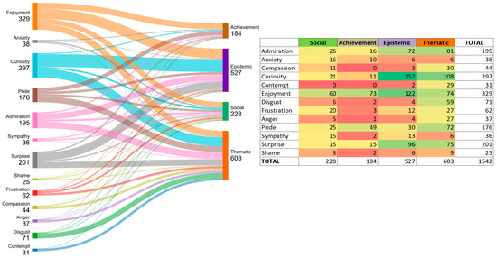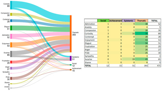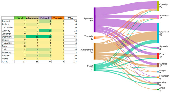 The programming and use of electronic controller boards and data collection devices within the STEAM project elicited a significant diversity of emotions among the students, as shown in Figure 3. Epistemic emotions accounted for 48.7% of the total, followed by achievement emotions (32.5%), social emotions (14.5%), and, to a lesser extent, thematic emotions (4.3%). These are described below: