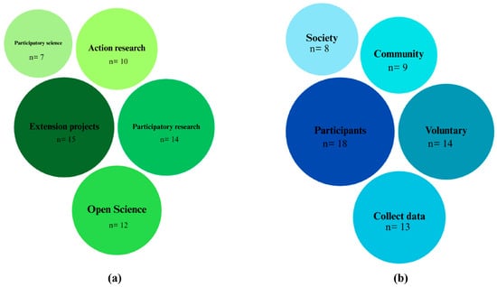 The concepts of citizen science and citizen scientists are represented by the prominent terms in the word clouds below (Figure 2a,b). When describing citizen science, the most prominent words were extension projects (n = 15), participatory research (n = 14), open science (n = 12), action research (n = 10), and participatory science (n = 7) (Figure 2a).