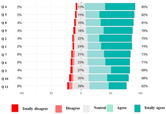 The responses presented on the Likert scale were analyzed in the R program, version 4.1.4, and the results were presented in graphs that indicate the percentage of agreement of the respondents for each question. This tool is widely used by researchers to assess perceptions and attitudes by indicating the degree of agreement or disagreement in relation to each question using five categories of responses that range from “totally disagree” to “totally agree” (; ).