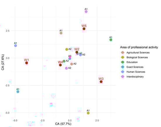 Correspondence analysis (CA) showing the relationship between professors’ areas of expertise (colored circles) and the words mentioned as concepts of citizen science (darker red circles). W1—extension project; W2—participatory research; W3—open science; W4—action research; W5—participatory science. A1—yes; A2—no; A3—I do not know how to answer.