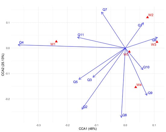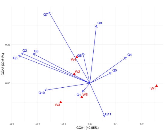 Canonical correspondence analysis (CCA) showing the relationship between the perception of the concept of citizen science and issues related to the importance and limitations of citizen science. W = Words (represented by the red triangle). W1—extension project; W2—participatory research; W3—open science; W4—action research; W5—participatory science. Q = Question. Q1—How important is citizen science (CS) for scientific research? Q2—Does CS involve the public in the scientific research process? Q3—Are the data obtained by volunteers (citizen scientists) reliable? Q4—Can the data obtained by citizen scientists be useful for scientific research? Q5—Do CS initiatives facilitate and expand the collection of scientific data? Q6—Do CS initiatives allow society to have access to the results of scientific research? Q7—Are CS initiatives a tool for scientific dissemination? Q8—Do CS initiatives contribute to raising awareness among citizens about the importance of science in solving society’s problems? Q9—Do CS initiatives function as a space for dialogue in which society presents demands to scientists to transform into an object of study? Q10—Do data collected by citizen scientists provide an economical solution for exploring research questions on a large scale? Q11—Do you believe that CS has limitations?