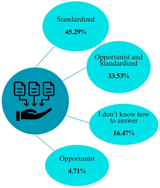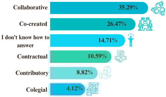 The results indicate that the most effective type of participation was the collaborative model (35.29%; n = 60), followed by co-created participation (26.47%; n = 45). In contrast, 14.71% of participants stated that they did not know/did not answer the question, and participants least frequently selected the contractual model (10.59%; n = 18), the contributory model (8.82%; n = 15), and the collegial model (4.12%; n = 7) (Figure 8).
