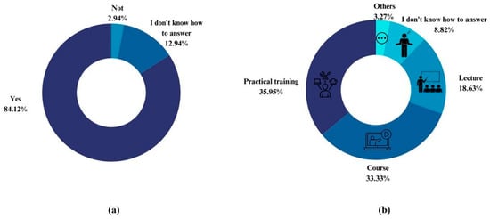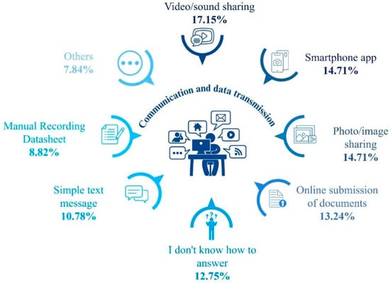 Among the most efficient methods perceived by professors for sharing and transmitting data were sending videos and audio clips (17.15%; n = 35), using smartphone applications and sharing photos and images, both with 14.71% (n = 30), and sending documents online (13.24%; n = 27). A total of 12.75% (n = 26) of respondents did not know how/did not want to answer. Other less frequently cited methods included simple text messages (10.78%; n = 22), the use of manually completed data sheets (8.82%; n = 18), and other means of communicating and transmitting data, such as “brochures, books, reports, newsletters, questionnaires, interviews, guided tours, radio, Instagram, face-to-face, and group discussions” (7.84%; n = 16) (Figure 9).