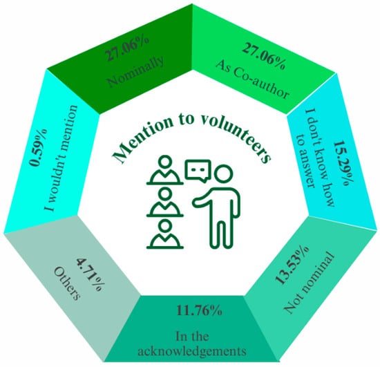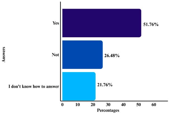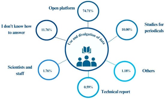 When asked how they would use citizen science data, the majority of professors (74.71%, n = 127) stated that they would make the data available on an open-access platform, accessible to anyone interested. A total of 11.76% (n = 20) responded that they did not know how the data would be used or preferred not to answer, while 10.00% (n = 17) indicated that the data would be used in studies with their results published in scientific journals. A small number of professors (1.76%, n = 3) said the data would be made available exclusively to scientists and research team members, and a slightly smaller portion (1.18%, n = 2) mentioned alternative approaches, such as applying ethical principles to regulate access or considering the target audience. Finally, only one participant (0.59%, n = 1) reported that the data would be used in technical reports. Notably, none of the respondents expressed disagreement with the idea of publishing the data (Figure 10).
