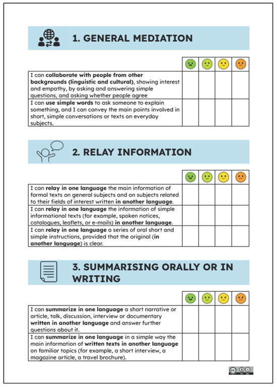 The third mismatch in this section pertains to singular languages that are assessed in current language assessments in Catalan schools which pertain to Catalan, Spanish, or English. These languages may form all or part of children’s linguistic repertoire (or not at all). Current assessments at primary school level do not assess plurilingual mediation practices (considered as strengths) that plurilingual children carry out. In the co-produced rubric, linguistic strengths were represented by the presence of plurilingual mediation descriptors (from the CEFR), and partners could assess how strong children were in relation to each descriptor using a 4-level Likert scale with smiley faces (Figure 2). Thus, the rubric made visible and represented primary aged children’s ability to carry out mediation activities and strategies plurilingually (Figure 2, Section 1 about “General mediation”) that reflected children’s meta- and cross-linguistic competencies. In sum, the rubric allowed children to reflect the meta- and cross-language competences (highlighted by Herdina & Jessner, 2002) that they could carry out, because the descriptors for plurilingual mediation in the CEFR had been jointly chosen by the children, the parents, and the schoolteachers. Although mediation appears in the curriculum (implying plurilingual mediation) it is naturally focused on school-taught languages which this rubric overcomes because it does not specify the languages that the children mediate in.