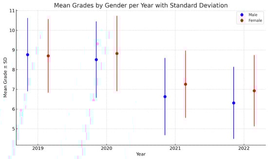 Mean grades by gender with error bars representing standard deviations (2019–2022).