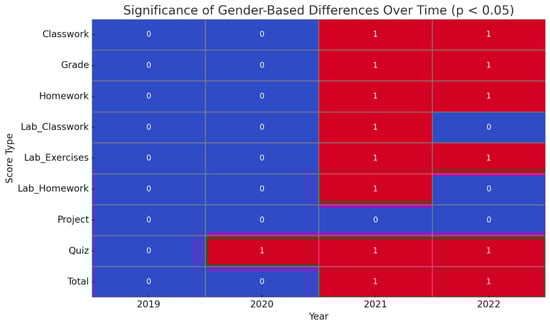 Figure 3 illustrates the significance based on a t-test over time, where red (1) indicates a statistically significant difference (p < 0.05) between male and female students for that score in that year, while blue (0) indicates that no significant difference was found.