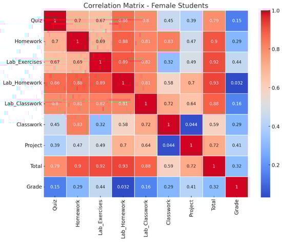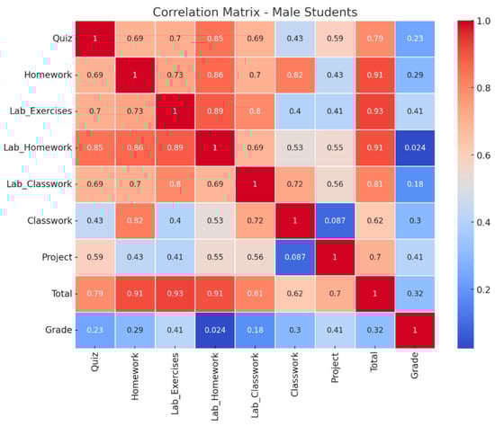 For male students, the strongest correlations were observed among lab homework, lab exercises, and homework activities. These deep interconnections indicate that performance in one area, such as lab homework, was closely tied to success in related practical and assignment tasks. Specifically, Lab_Homework and Total Score showed an exceptionally high correlation (0.93), followed by Lab_Homework and Lab_Exercises (0.89) and Homework and Lab_Homework (0.88). On the other hand, correlations between grade and other metrics were notably weak for males, particularly with Lab_Homework (only 0.03) and Quiz (0.15). This suggests that grades for male students were less directly tied to their detailed coursework scores.